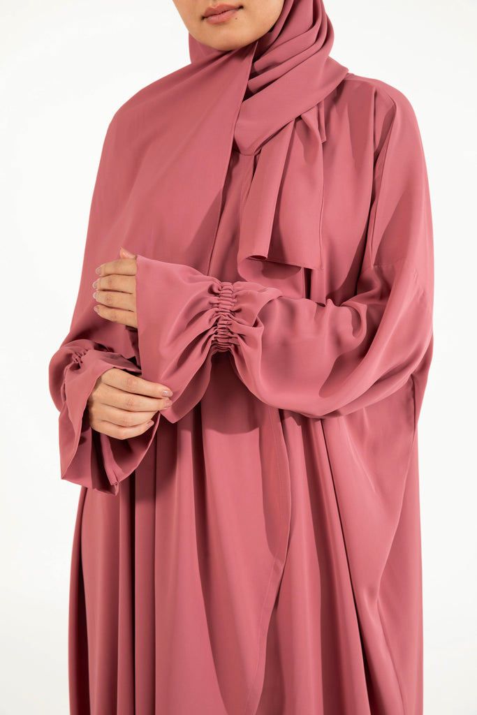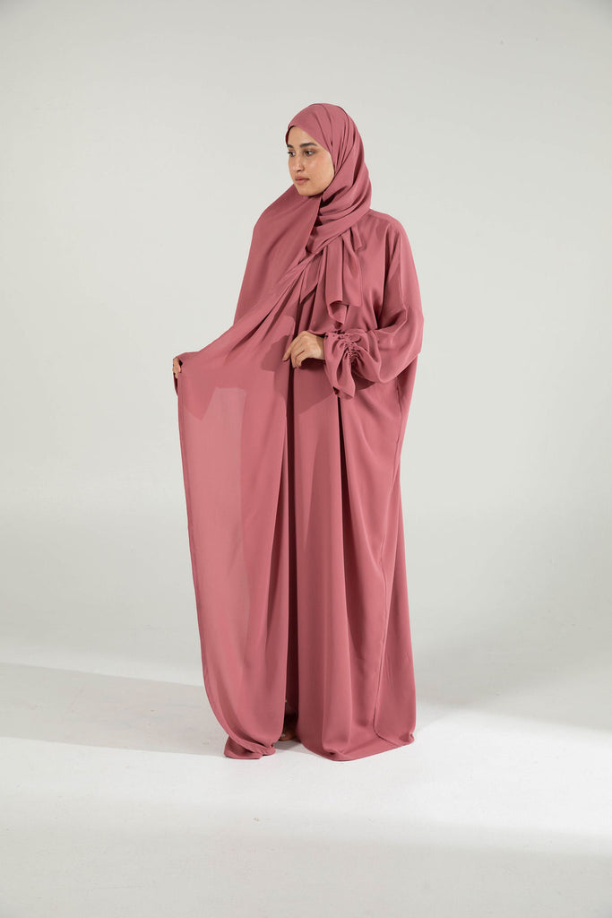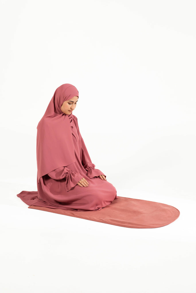 ثوب صلاة بتصميم البشت إضافة إلى شيلة متصلة باللون نفسه، تصميم عملي وسريع الإرتداء.