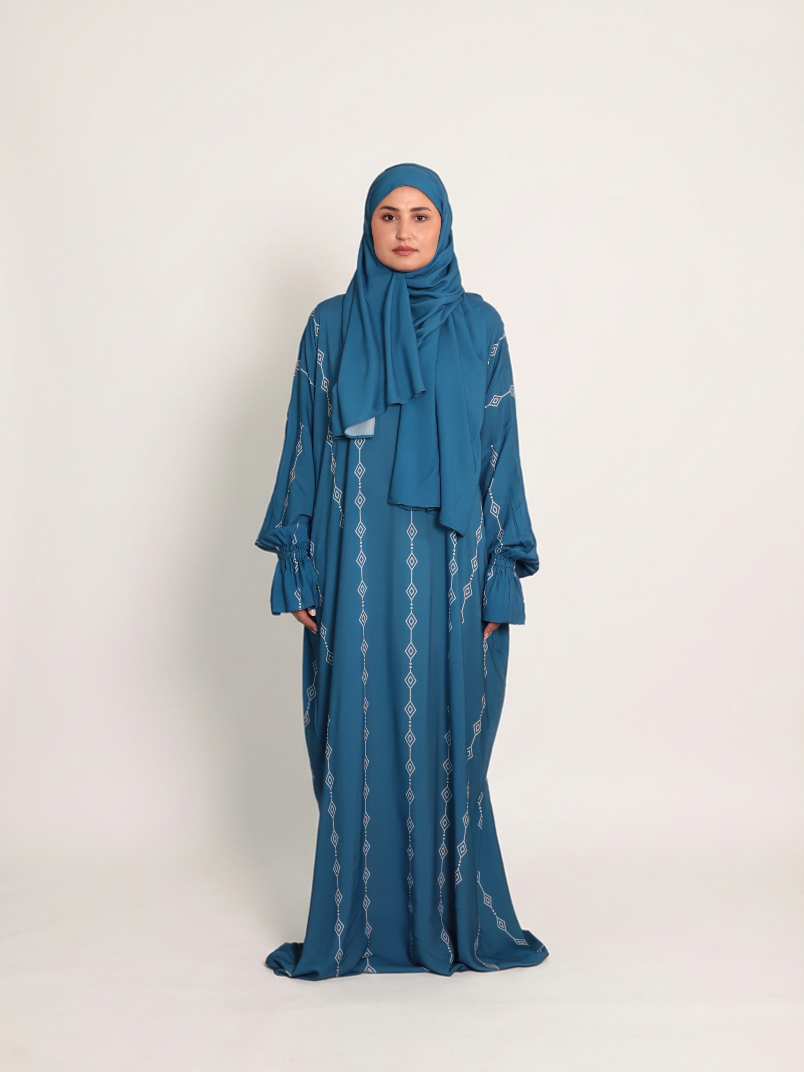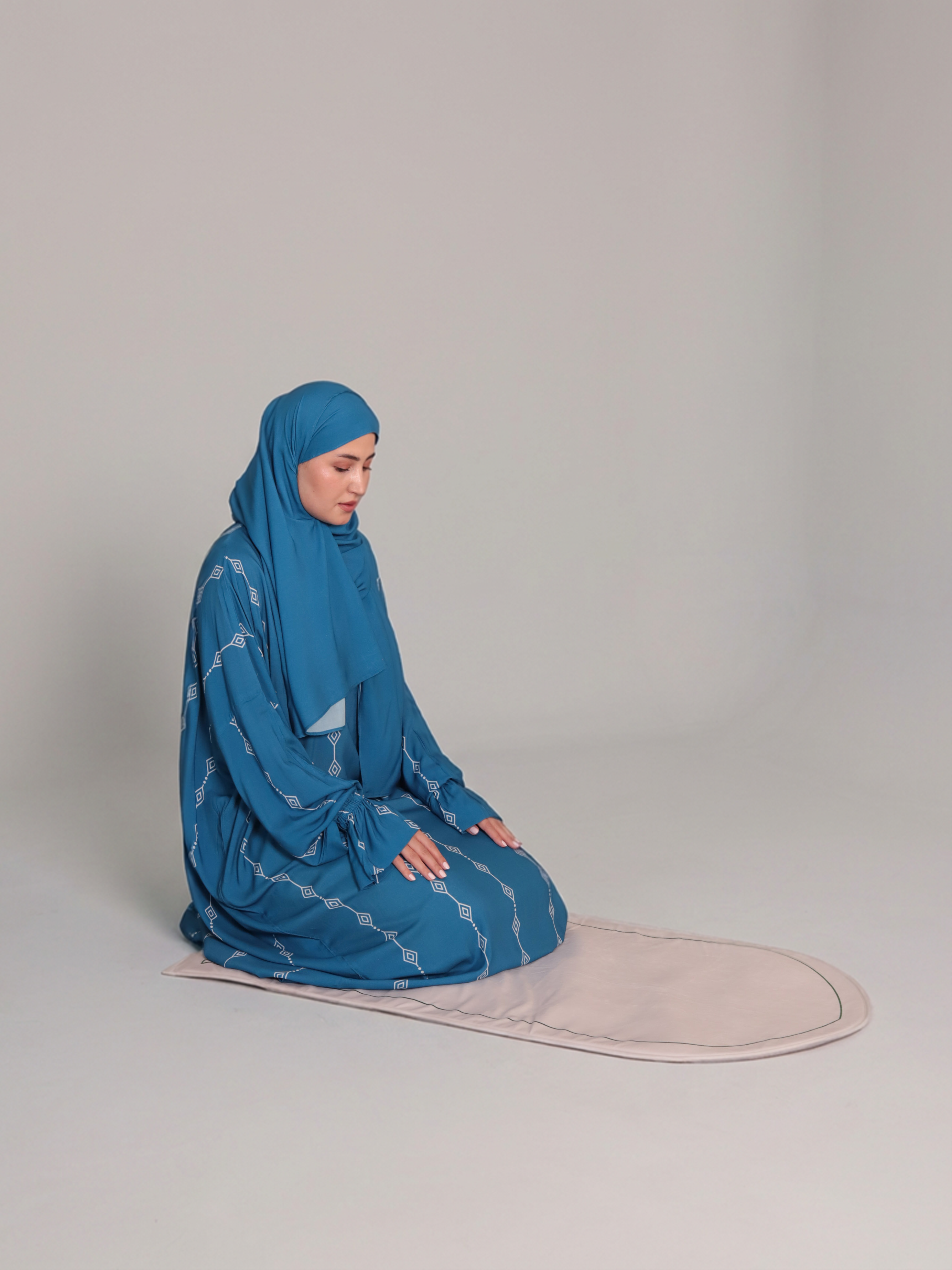One-piece praying cloth with an attached scarf for easy wear. Designed with a front zipper and comfortable elastic hand bands.