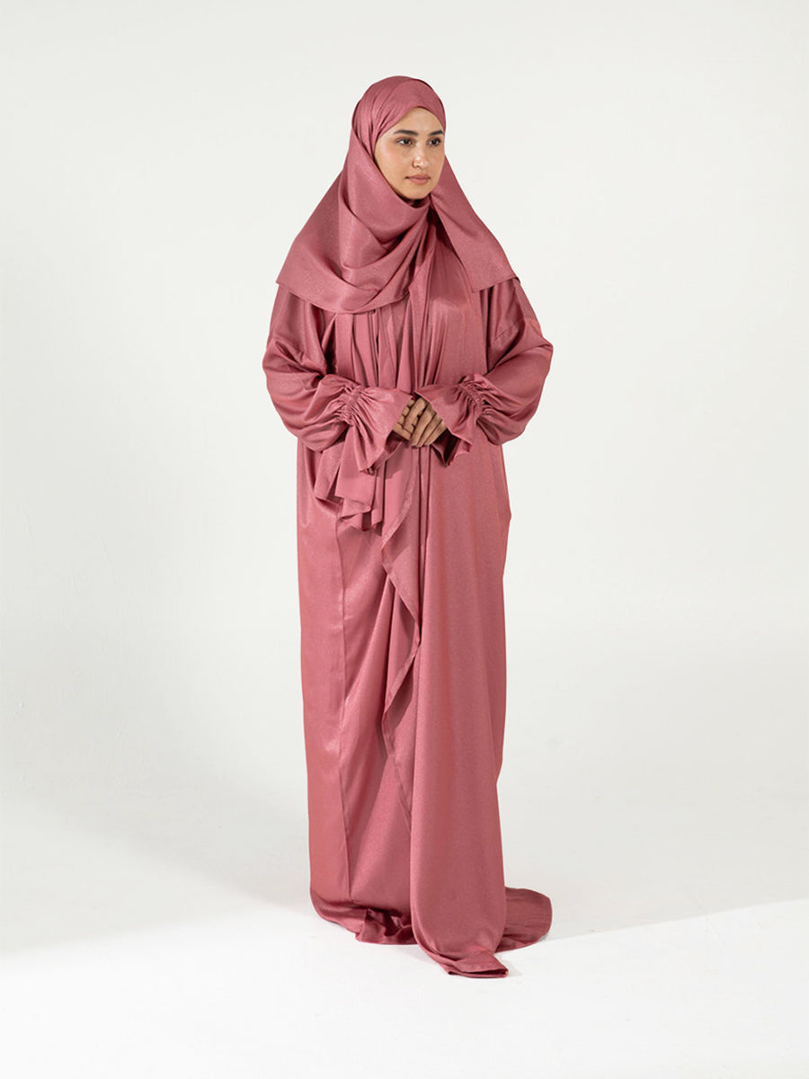 ثوب صلاة بتصميم البشت إضافة إلى شيلة متصلة باللون نفسه، تصميم عملي وسريع الإرتداء.