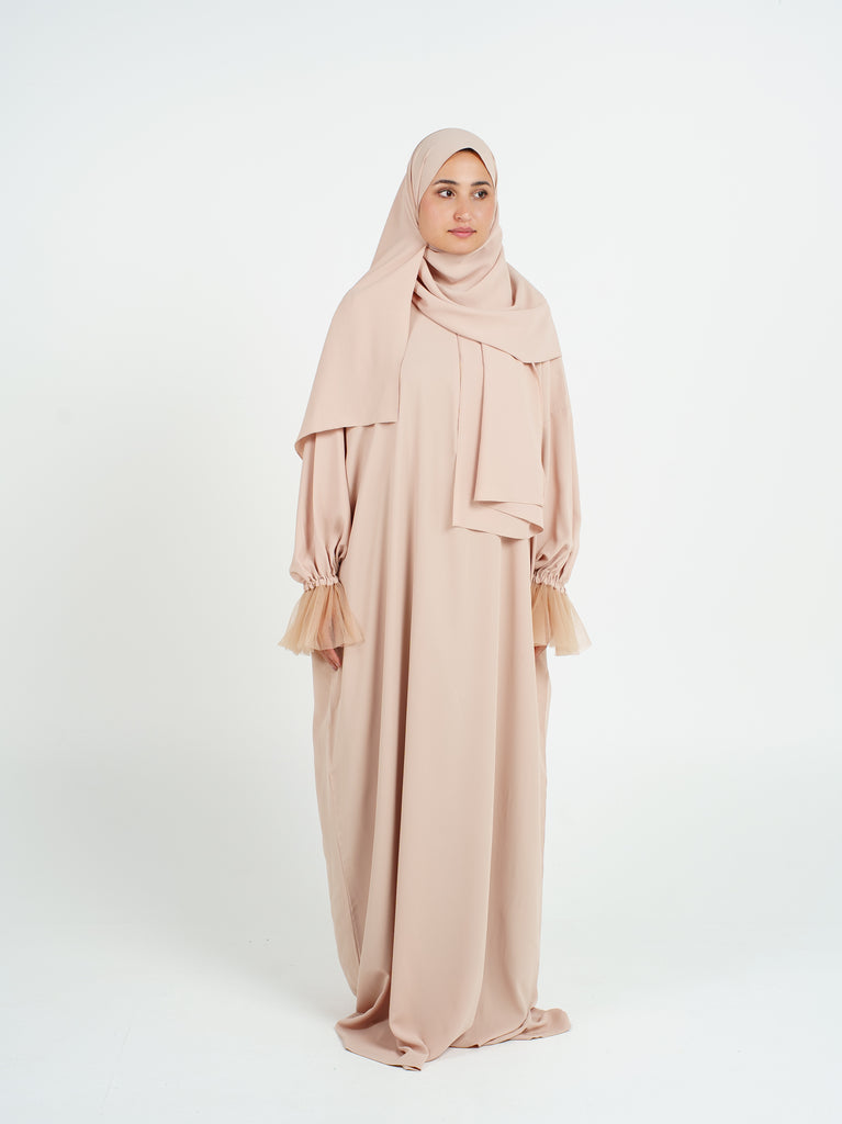 • MATERIAL: The prayer dress is made of breathable Crepe fabric with Mesh details on the sleeves Reflecting the label's modest yet luxe aesthetic.